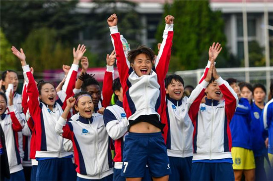 10月11日,武汉车都江大队球员王霜(前)在颁奖仪式上庆祝。新华社记者 胡超 摄