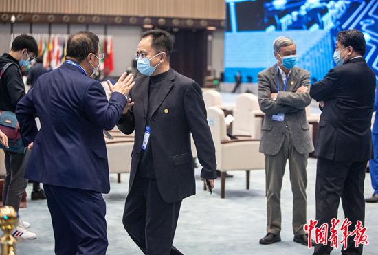 11月23日,浙江桐乡乌镇,2020年世界互联网大会·互联网发展论坛开幕式即将开始,奇安信集团董事长齐向东(前排左)等参会嘉宾相互问候。尽管受新冠肺炎疫情影响规模缩小,本届论坛仍有530余位嘉宾来到乌镇线下参会。