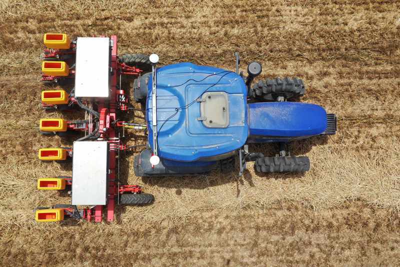 在河南省邓州市小杨营镇安众村,加装有北斗导航系统的拖拉机在无人驾驶状态下播种(2020年5月26日摄,无人机照片)。 新华社记者 冯大鹏 摄