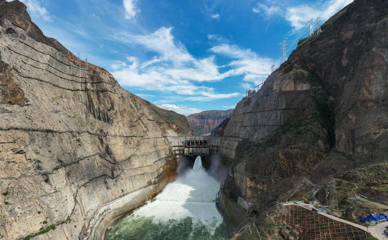乌东德水电站大坝(2020年6月29日摄,无人机照片)。世界第七、中国第四大水电站——乌东德水电站首批机组于6月29日投产发电。新华社记者 胡超 摄