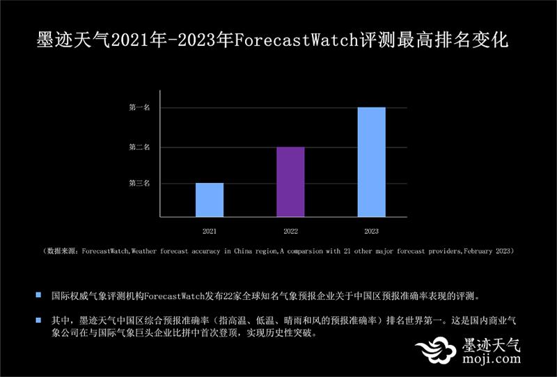 近期,国际权威天气预报监测和评估公司ForecastWatch公布了2月全球气象企业在中国区预报准确率评测结果:墨迹天气在中国区1-3天综合预报准确率(高温、低温、晴雨、风速)中排名第一,并同时斩获高温、风速单项预测准确率第一,成为国内首家在该类评测中获得第一的气象企业,墨迹天气取得这一亮眼的成绩,离不开其深耕气象领域十几年间的不断探索和创新,以及找准了“锚点”。