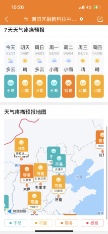 墨迹天气「天气疼痛预报」综合全国各地气压变化等情况,将天气疼痛的发病风险分为“不易疼痛”“可能疼痛”“容易疼痛”和“极易疼痛”4个等级进行示警。墨迹会员用户可查询24小时天气疼痛预报和7天内的天气疼痛预报,尽可能在症状出现前进行干预处理,例如在台风过境前,可查看「天气疼痛预报」发病风险等级,提前做好预防,可避免长时间保持同一姿势,做伸展运动放松肌肉或泡澡来应对“台风性头痛”。此外,有出行需求的用户可以通过“天气疼痛预报地图”功能了解全国各地天气疼痛发病风险,避开不利的出行时段和地区,做到安心无忧出行。