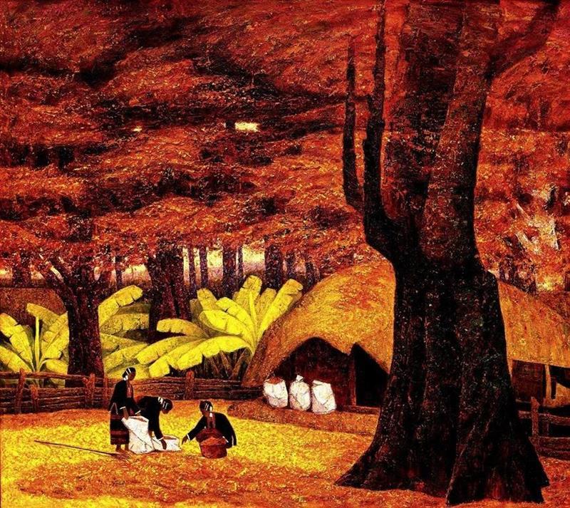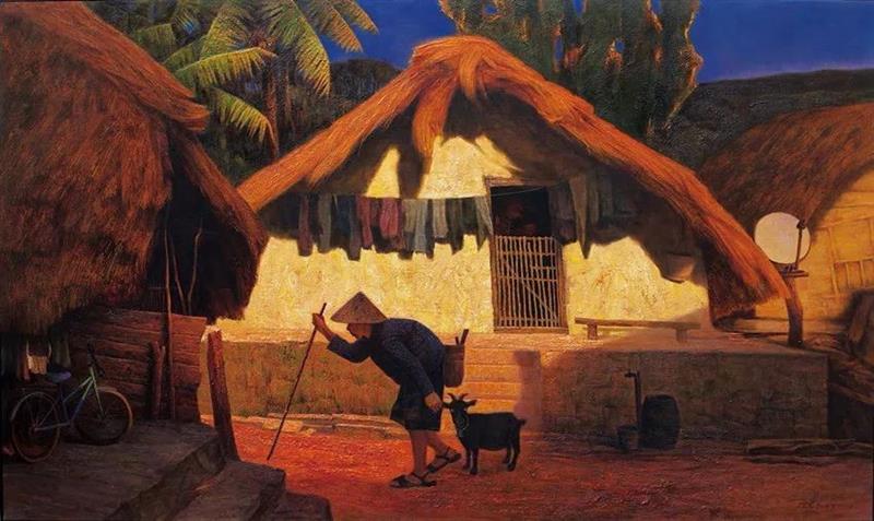 在他创作的《二月的歌》《花开花落》《春天的脚步》《家在对岸》等一系列作品中,以极其热烈真实的色调、准确的造型、飘逸的外在精神,把盘桓天际的榕树,一望无际的芭蕉林,恍如隔世的船型屋,夕阳下归家的牧童,勤劳朴实的黎家汉子,纯真美丽的黎家少女,独具匠心艺术的再现出来。其作品既有传统的审美,又融入当代的美学特质;既尊重海南本土文化,又强调人文和理性精神;作品不但形象纯美、色彩明丽、且又有鲜明的地域特色,突显出油画艺术自身的品格与极富表现的造型功底,体现出东西方文化在作品中的碰撞与交融,把油画本土化、民族化的魅力发挥到极致。充分展示出海南地域文化的一种独特之美,一种热带雨林神秘之美,一种海天一色的宁静之美,一种天人合一的境界之美。