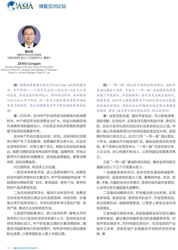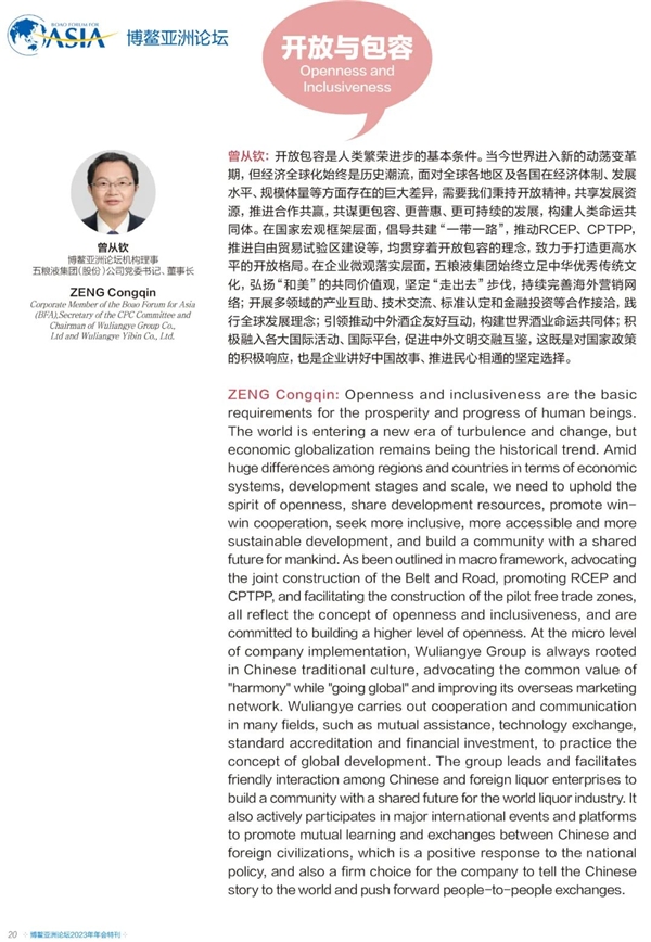五粮液集团(股份)公司董事长曾从钦受邀对话博鳌,在活动伊始就发展机遇、全球互联互通等年度热点议题分享探讨,以“和而不同,美美与共”的开放包容及和美文化理念,向世界分享了锚定“确定性”的东方解答,全文内容刊载于《博鳌亚洲论坛2023年年会》会刊。