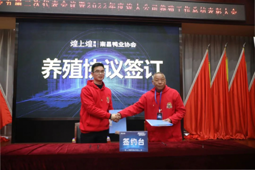 江西省畜牧研究所所长韦启鹏、南昌县农业农村局副局长熊国保、南昌县小蓝兽医站站长喻志平等特邀莅临大会,煌上煌集团总裁褚剑、股份公司副总经理范旭明、股份公司副总经理曾细华、煌大公司副总经理樊友发、总经办副主任陈建坤、总经办副主任肖文英,及南昌鸭业协会的理事会成员、养殖户代表和战略合作伙伴们共同参会。