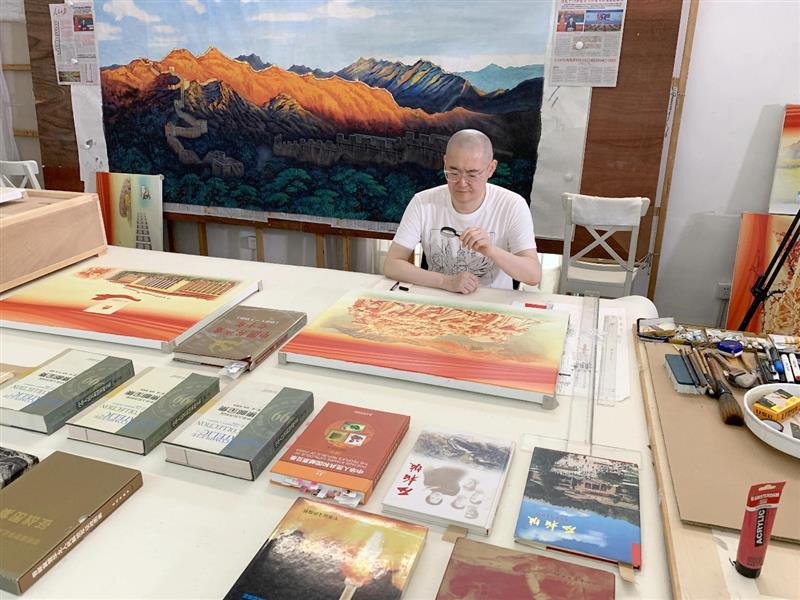 郝军正在绘制人民大会堂壁画《金山岭晨光》