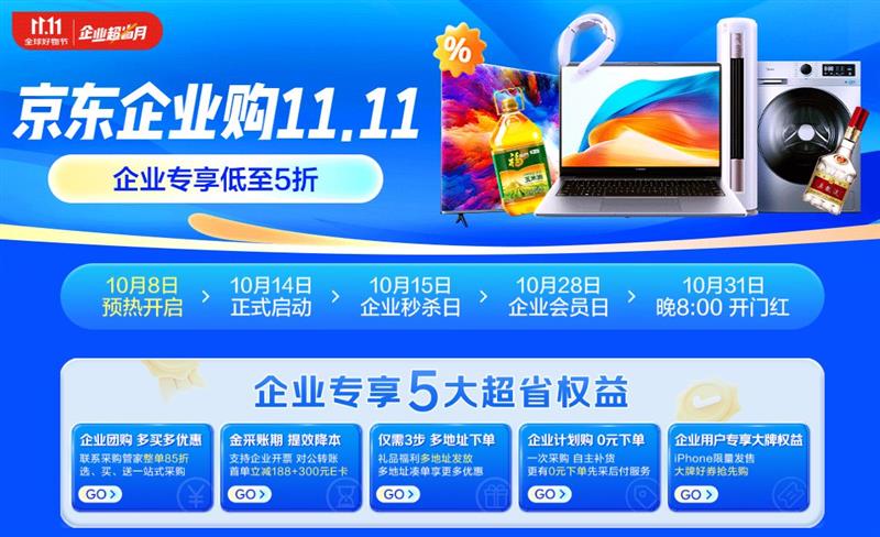 10月14日晚8点,京东11.11现货开卖,超百项行业首创和独有服务,为消费者“又便宜又好”的购物体验保驾护航。作为京东为企业提供数字化采购服务及标准化采购解决方案的一站式平台,京东企业购也同步上线“企业超省月”,助力企业降本增效、开启更有力的增长。