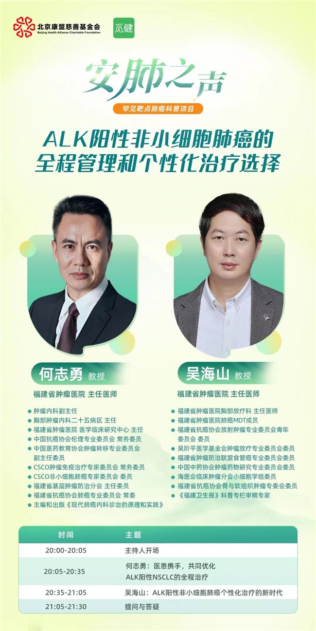 届时,何志勇、吴海山两位教授除了对ALK阳性非小细胞肺癌的个性化治疗进行全方位的解读,还将与病患及家属展开互动。在提问与答疑环节,两位教授还将针对患者及家属提出的问题一一进行解答。