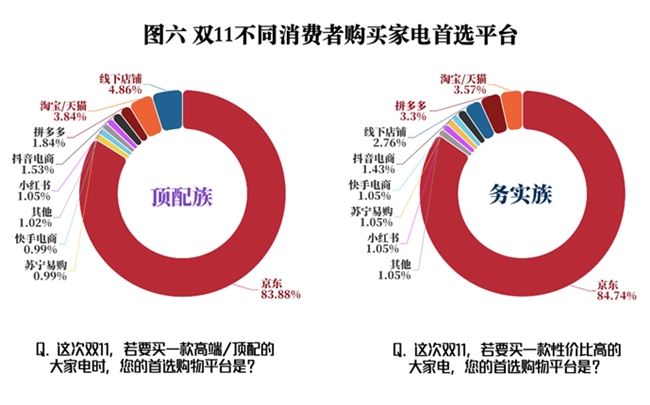 调查数据显示,在平台选择上,多样化供给和优秀的综合服务能力,使京东成为不同类型消费者的首选。对优先购买高端/顶配大家电的“顶配族”,83.88%的受访者首选京东购买家电,认可其“家电消费主场,新品大牌首发和品质信赖”的定位,排名其后的为线下渠道,具备“可实地体验”的优势,以及淘宝/天猫,以“活动广、品牌选择多”的特点吸引消费者。而对购买高性价比大家电的“务实族”,京东仍是84.73%的受访者的首选,认为其“补贴直给、型号齐全、服务可靠”;排名其后的是淘宝/天猫和拼多多。