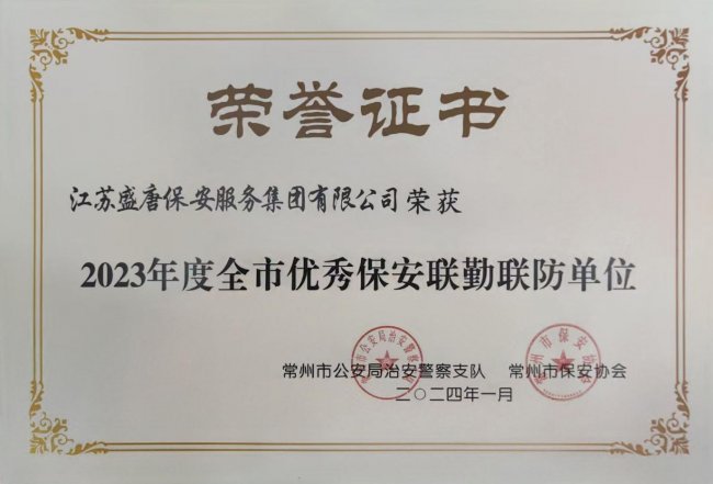 江苏盛唐保安服务集团有限公司荣获“2023年度全市优秀保安联勤联防单位”称号