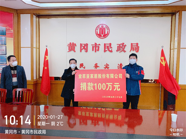 2020年1月26日,索菲亚家居股份有限公司(以下简称索菲亚)通过黄冈市慈善总会向黄冈疫区首笔捐款100万元,作为疫情防控专款使用。1月27日,捐赠仪式在黄冈市民政局举行,索菲亚公司代表刘小春, 黄冈市慈善总会常务副会长、市民政局局长闫吉,黄冈市慈善总会副会长兼秘书长邹德元出席捐赠仪式。