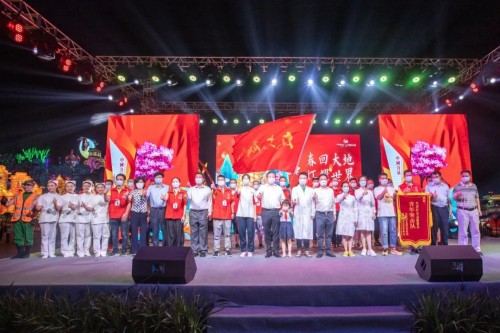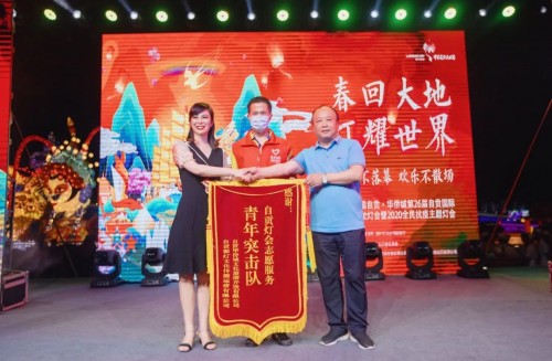 精彩纷呈的闭幕式,也充分展示了自贡灯会作为全国最大型民俗活动之一的吸引力。自贡市民与来自各地的游客欢聚一堂,线下活动与网上直播隔空呼应。当华侨城公司与彩灯运营公司共同为自贡灯会志愿服务青年突击队代表颁奖,感谢他们为这届特殊自贡灯会做出的无私奉献时,全场更是掌声雷动、经久不息。
