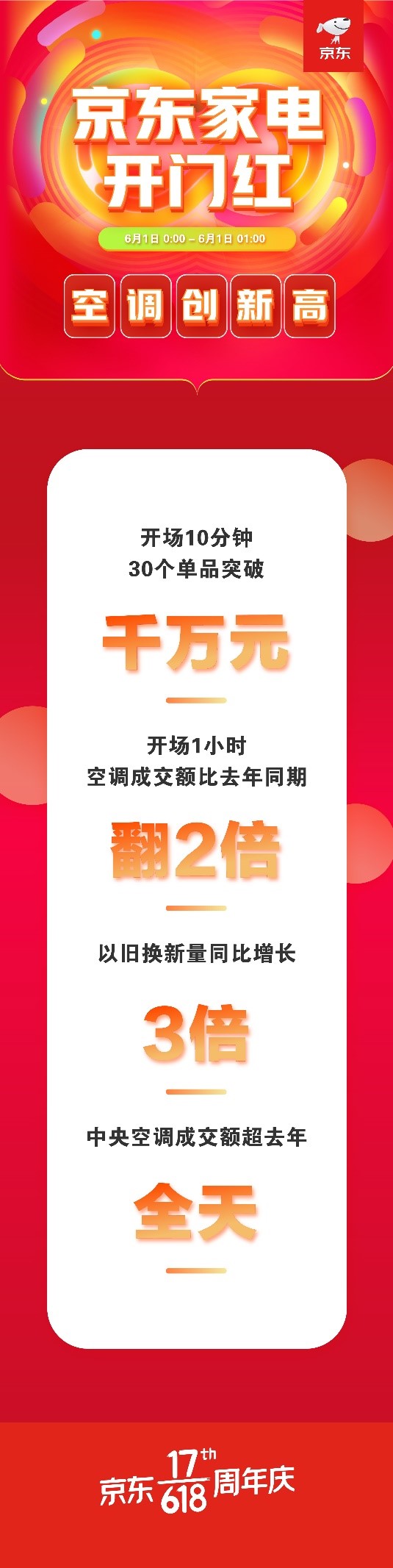 6月1日,京东万众瞩目的618全球年中购物节迎来火爆开门红。0点开场的短短一个小时内,京东家电各品类销量成绩喜人。作为夏季热门选手,京东空调以超大优惠力度、超足备货量、超级创新服务发起了史上最省钱的空调季,吸引消费者争相购买。6月1日0点刚过10分钟,京东平台上已有30个空调单品的成交额突破千万元,开场1小时空调品牌总成交额比去年同期翻2倍,以旧换新量同比增长3倍,中央空调成交额超去年全天。