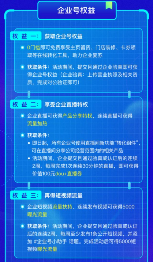 另一方面,巨量引擎还对企业号产品进行功能升级,只要完成企业信息验证便可以免费使用近20项功能权益。同时,向企业号直播间开放新功能转化组件,复苏计划期间的新企业号,只要进行连续且满足活动规则的直播,便可以获得官方赠送的价值百元的直播加热流量。此外,还面向线下商家(餐饮、休闲娱乐、购物等)推出了企业号团购功能和购物车等。