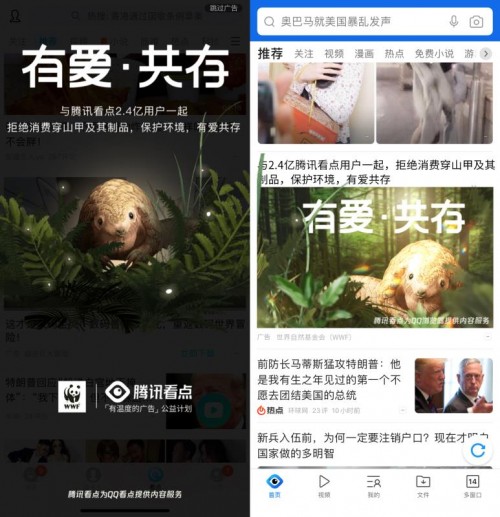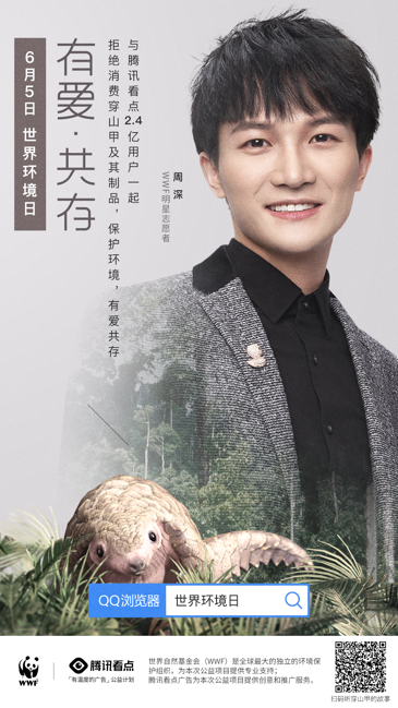 6月5日世界环境日,腾讯看点与世界自然基金会(WWF)共同发起“有爱·共存”穿山甲公益保护行动,通过创意海报、H5小游戏、公益视频等形式,呼吁拒绝消费穿山甲及其制品。同时,腾讯看点发布“有温度的广告”公益计划,宣布将在每个季度为合作基金会提供百万级别的广告资源,联合品牌方打造公益事件。