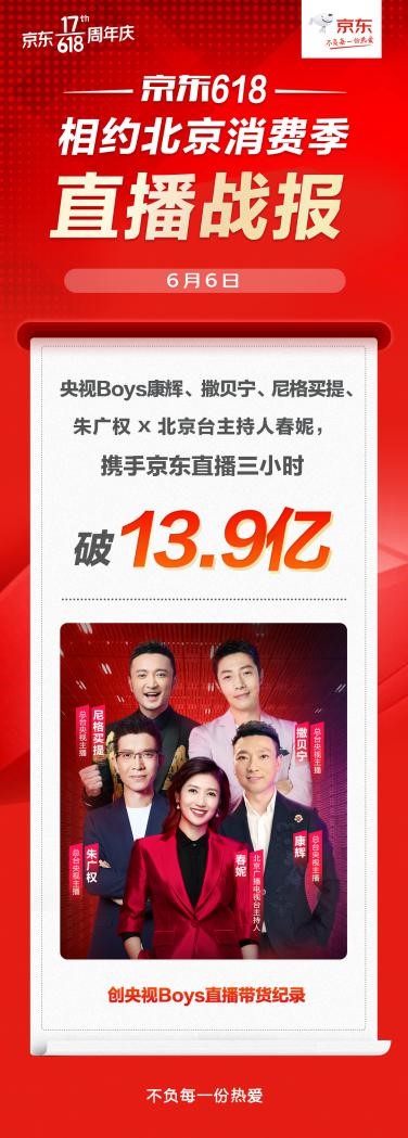 6月6日,北京消费季在京东618期间正式开启,“央视Boys”天团康辉、撒贝宁、尼格买提、朱广权和北京电视台主持人春妮现身京东直播间开启“用段子带货”模式,现场安利老北京茶叶品牌吴裕泰的茉莉花茶。