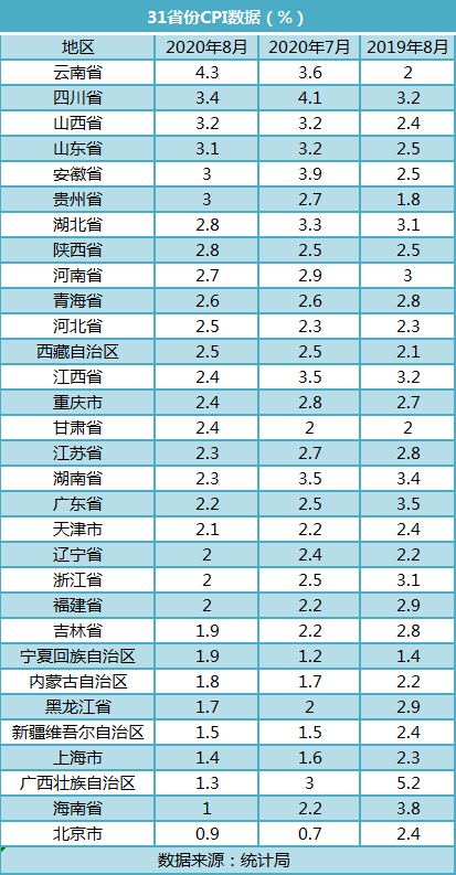 从全国来看,国家统计局数据显示,2020年8月份,全国居民消费价格同比上涨2.4%。