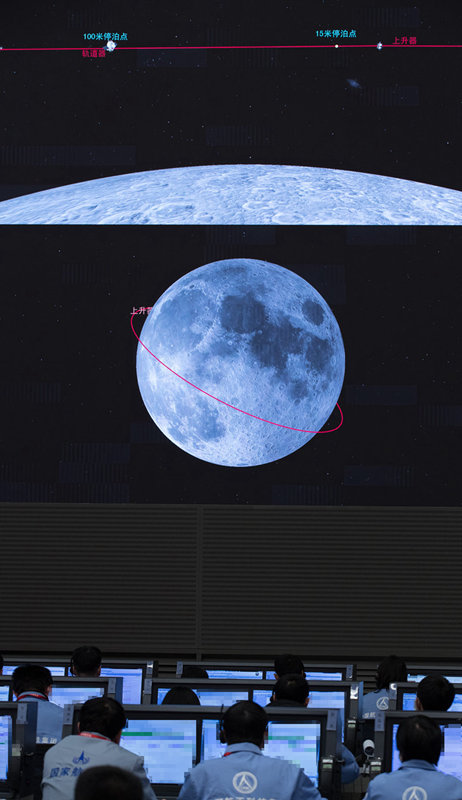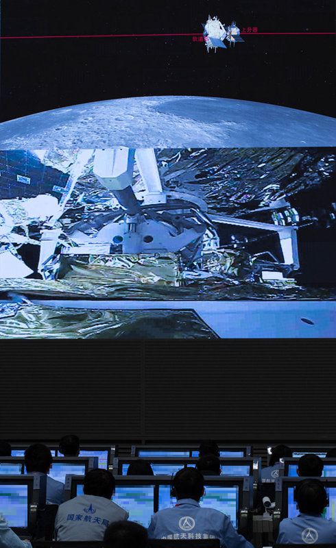 12月6日,航天科技人员在北京航天飞行控制中心指挥大厅监测嫦娥五号上升器与轨道器返回器组合体交会对接情况。