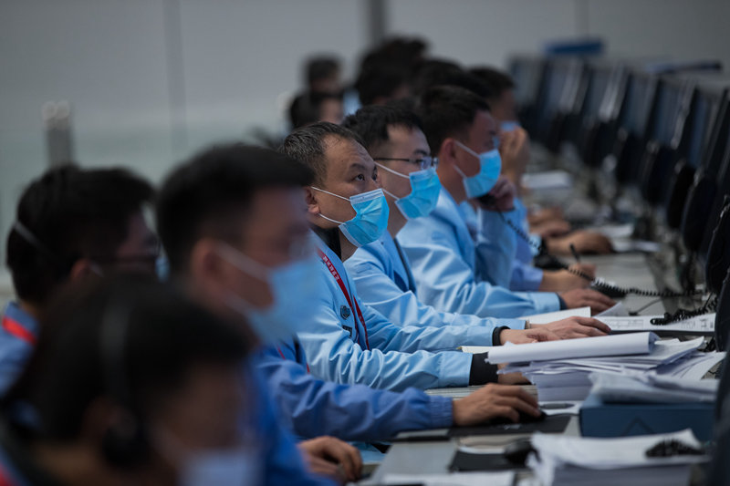 12月6日,航天科技人员在北京航天飞行控制中心指挥大厅监测嫦娥五号上升器在轨将月球样品容器转移至返回器情况。新华社记者 金立旺 摄