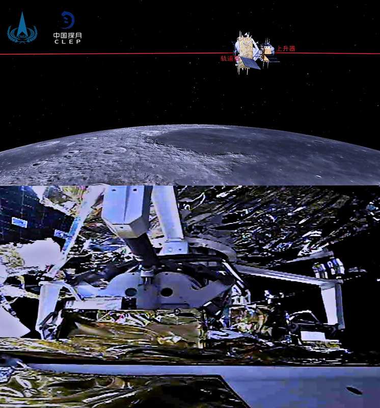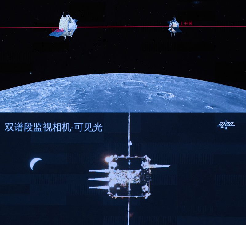这是嫦娥五号轨道器返回器组合体逐渐接近上升器画面。新华社发(国家航天局供图)