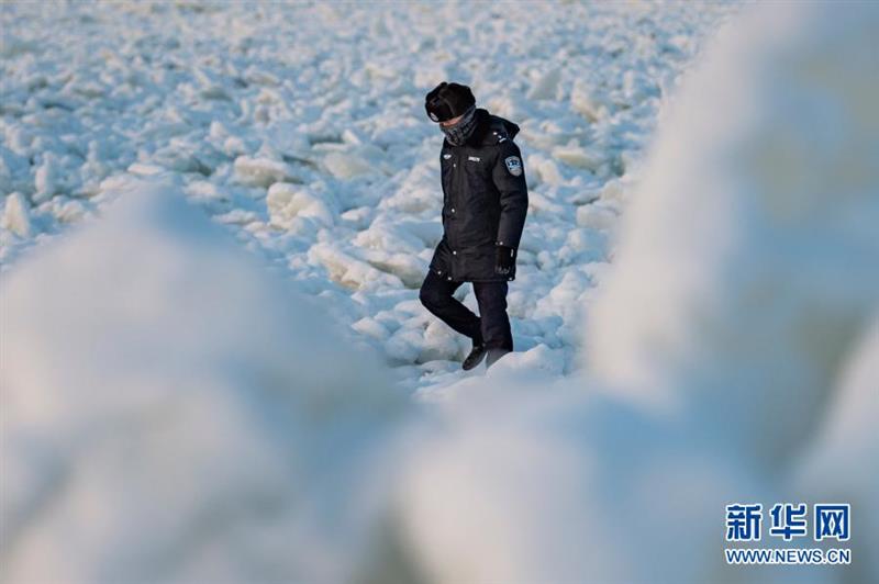 2021年1月9日,史先强在洛古河村旁封冻的黑龙江面上进行边境巡逻。新华社记者 谢剑飞 摄