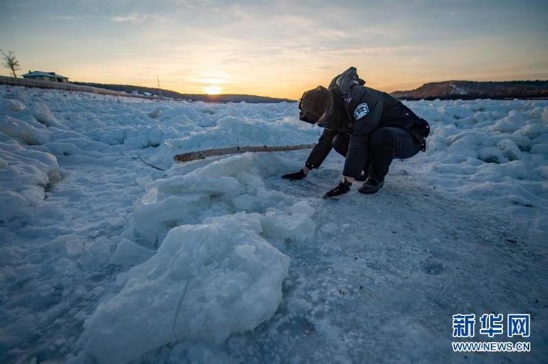 2021年1月9日,史先强在洛古河村旁封冻的黑龙江面上查看是否有偷捕者的暗网。新华社记者 谢剑飞 摄