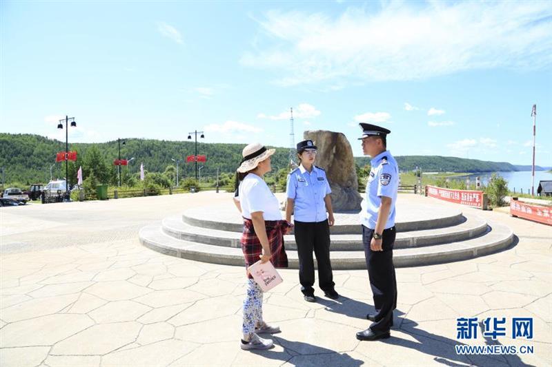 在漠河市北极镇洛古河村,史先强和妻子沈欣(中)在给游客宣传边境法律法规(2020年7月22日摄)。新华社发