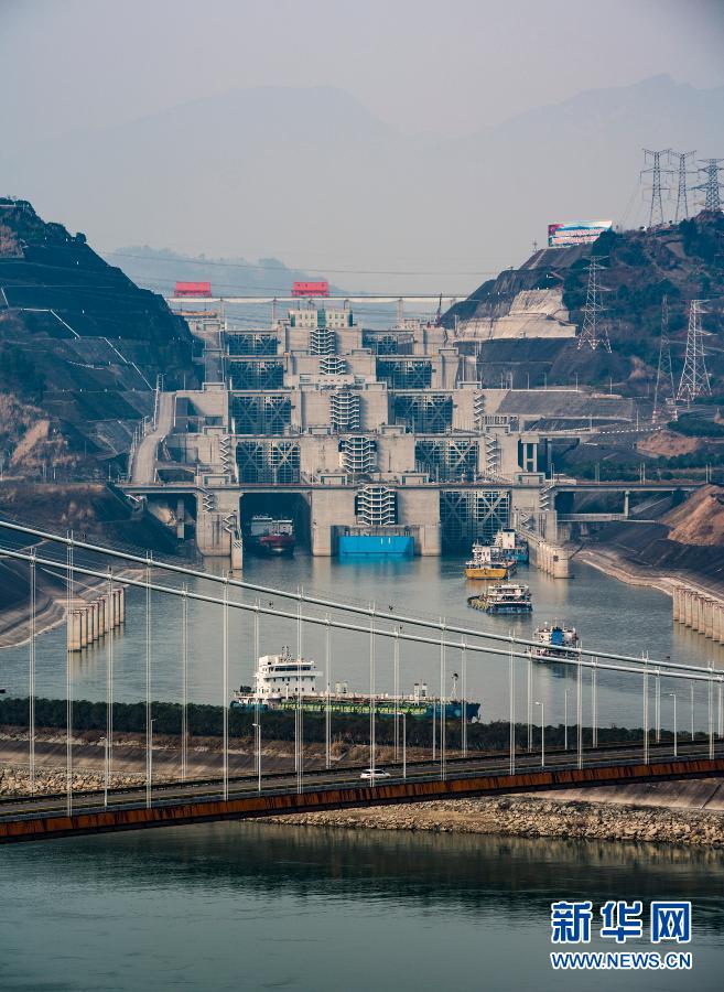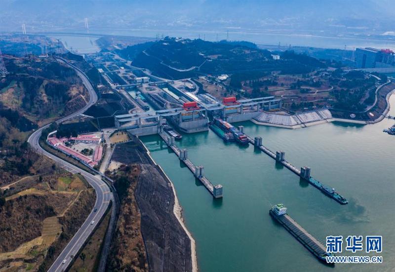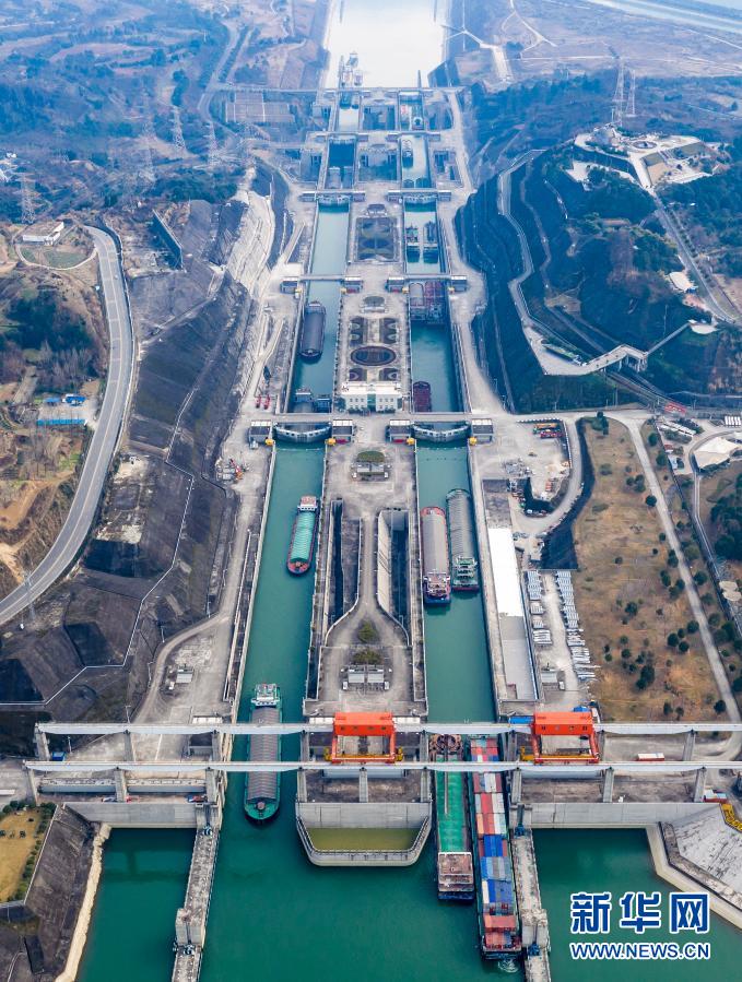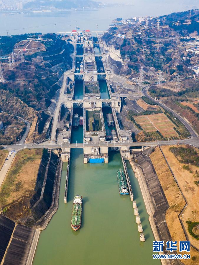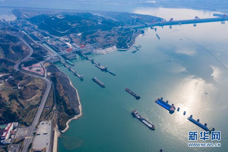 1月10日,船舶有序通过三峡五级船闸。新华社发(向红梅 摄)
