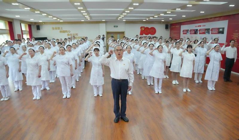 湖北武汉金银潭医院,武汉市卫健委系统新党员入党宣誓活动在此举行,“人民英雄”国家荣誉称号获得者张定宇领誓。新华社记者程敏摄