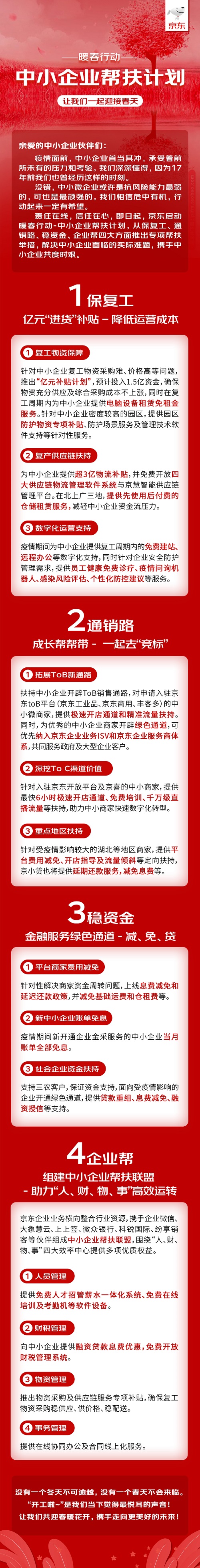2月21日,京东启动“中小企业帮扶计划”,从保复工、通销路、稳资金、企业帮扶联盟四个维度推出13项帮扶举措,累计投入近5亿的资金资源补贴,直击中小企业的生存成长难题。