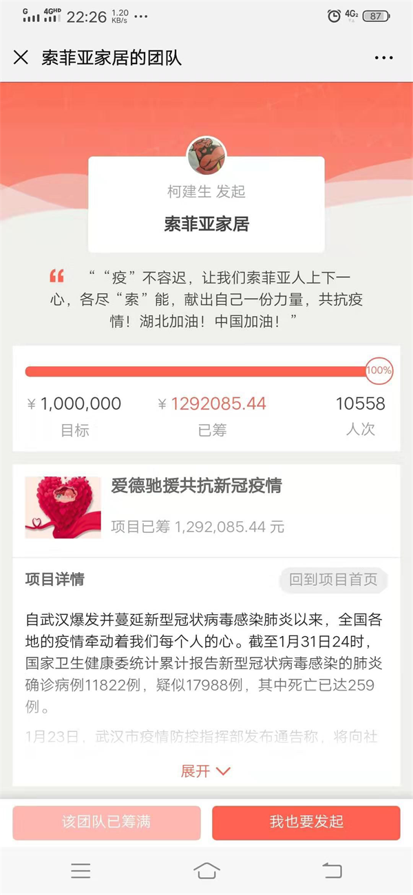 万人同心送温暖,索菲亚家居30小时共筹集善款近130万元。