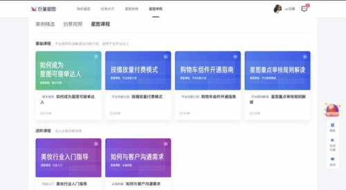 除了提升客户的使用体验,此次官网升级也考虑到了创作者的进阶需求。新版官网为创作者增加了自我介绍、优惠券功能,进一步提升创作者的自身运营能力。此外,星图学院沉淀了更多平台优秀案例、创意视频与培训课程,可以帮助创作者们快速积累创作经验,进一步实现个人商业化成长。