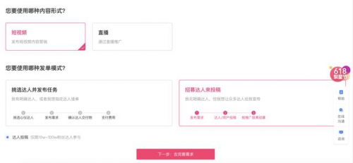 如在客户在线brief环节,巨量星图官网将营销目标、投放渠道和内容形式这三大核心诉求整合展现在首页,客户根据页面提示选择需求,巨量星图精准匹配创作者,进一步提升使用便利度。