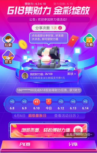 活动期间,每日用户可参与PK赛,获胜队伍队员可获得50财力值,获胜队队长可额外多获得20财力值;失败队伍所有队员可获得鼓励奖5财力值。分享活动邀请好友参与活动,被邀请者从分享链接每日首次登录活动页,邀请者可获得5财力值;当日累计成功分享10/20/30次可额外获得10/20/30财力值。此外,每日拉新、挖宝、签到也可获得相应财力值。