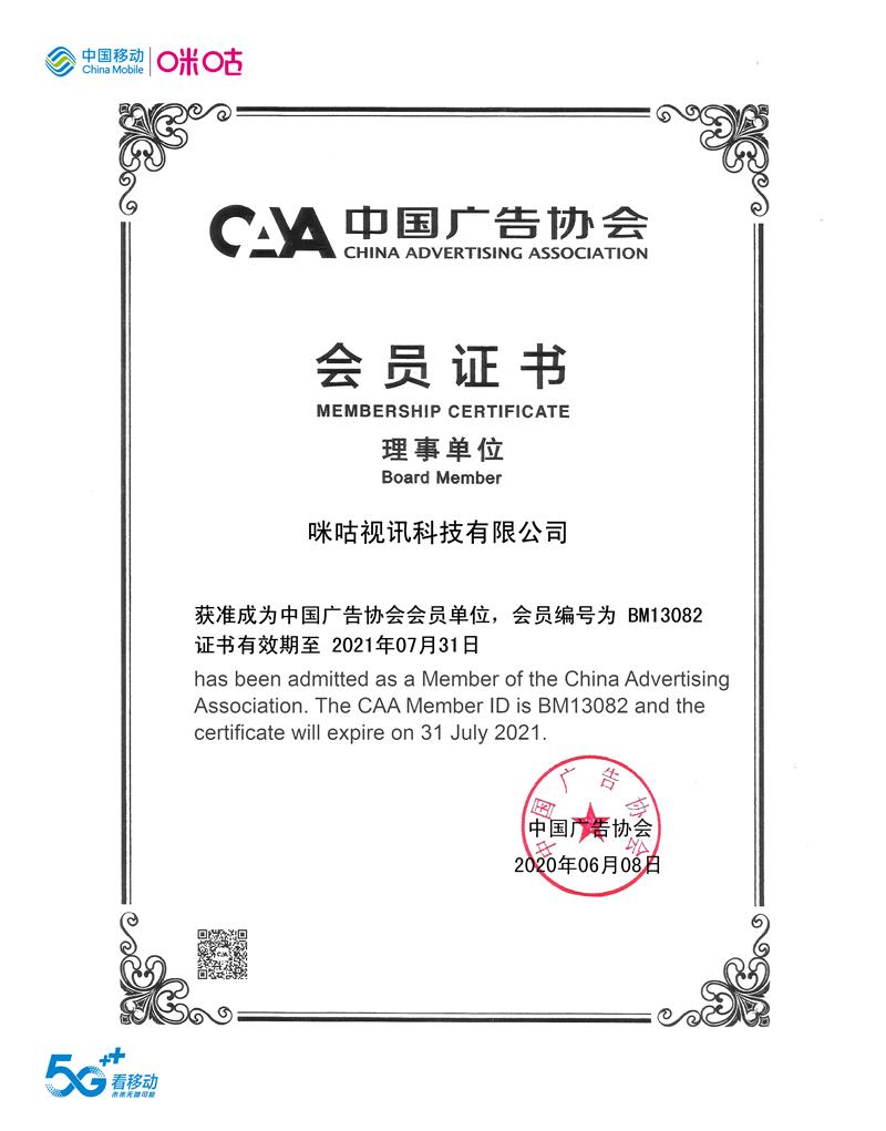 2020年6月8日,中国移动咪咕公司正式成为中国广告协会理事单位。据了解,未来双方将会在共同制定行业标准、共建标准实验室等方面展开深度合作。