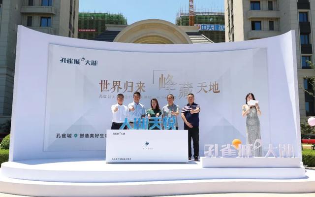 随着现场观众倒计时"3、2、1"欢呼,彩色气球应声升空,各位领导将染色的湖水注入启动装置中,标志着环湖路的最后一个地块,孔雀城历经17载水域筑峰——孔雀城大湖楼王示范区正式璀璨开放。